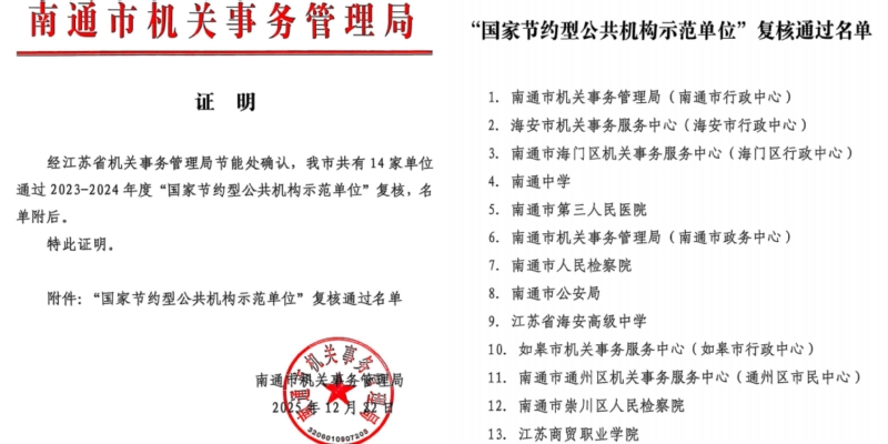 近日,江苏省机关事务管理局正式发文通知,我校成功通过“国家节约型公共机构示范单位”复核,这是国家机关事务管理局、国家发展改革委、财政部对我校长期深耕节能减排、践行绿色低碳发展理念的权威认可与高度肯定。